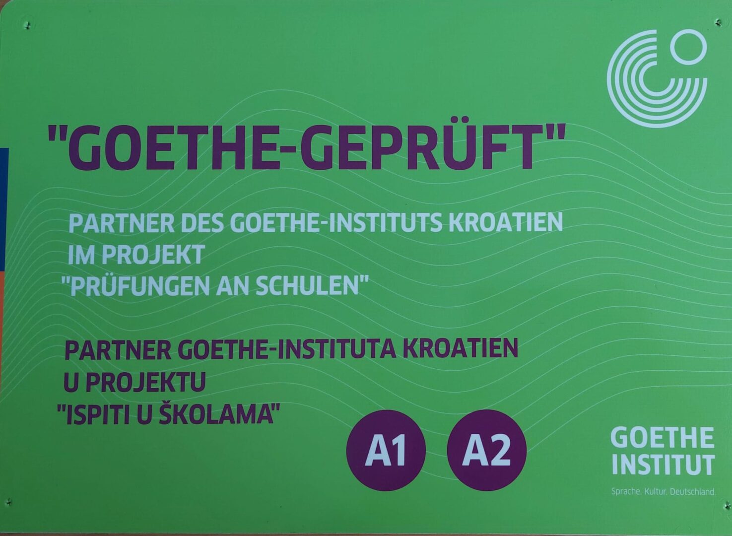 Naša škola je ove godine postala partner Goethe instituta u projektu “Ispiti u školama“. Ispiti Goethe-Zertifikat A1: Fit in Deutsch i Goethe-Zertifikat A2: Fit in Deutsch namijenjeni su mladima koji uče njemački jezik u školi i odgovaraju prvom stupnju (A1) odnosno drugom stupnju (A2) šestostupanjske ljestvice kompetencija Zajedničkog europskog referentnog okvira za jezike (ZEROJ).